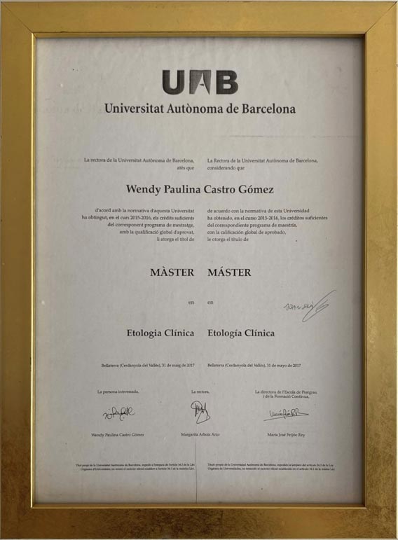 En el 2016 realizó estudios de maestría en etología clínica en la Universidad Autónoma de Barcelona.